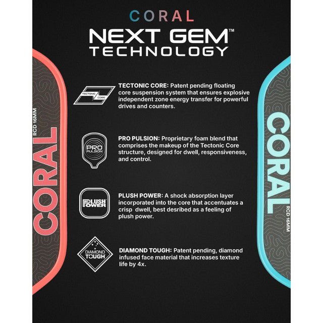 All Coral shapes share the same advanced tech: a Diamond Tough raw carbon face for texture that holds up, a floating Tectonic Core Suspension System that shifts through impact zones for improved stability and energy return, and dual Propulsion Foam layers that increase dwell, reduce vibration, and keep the ball on the face that split-second longer.